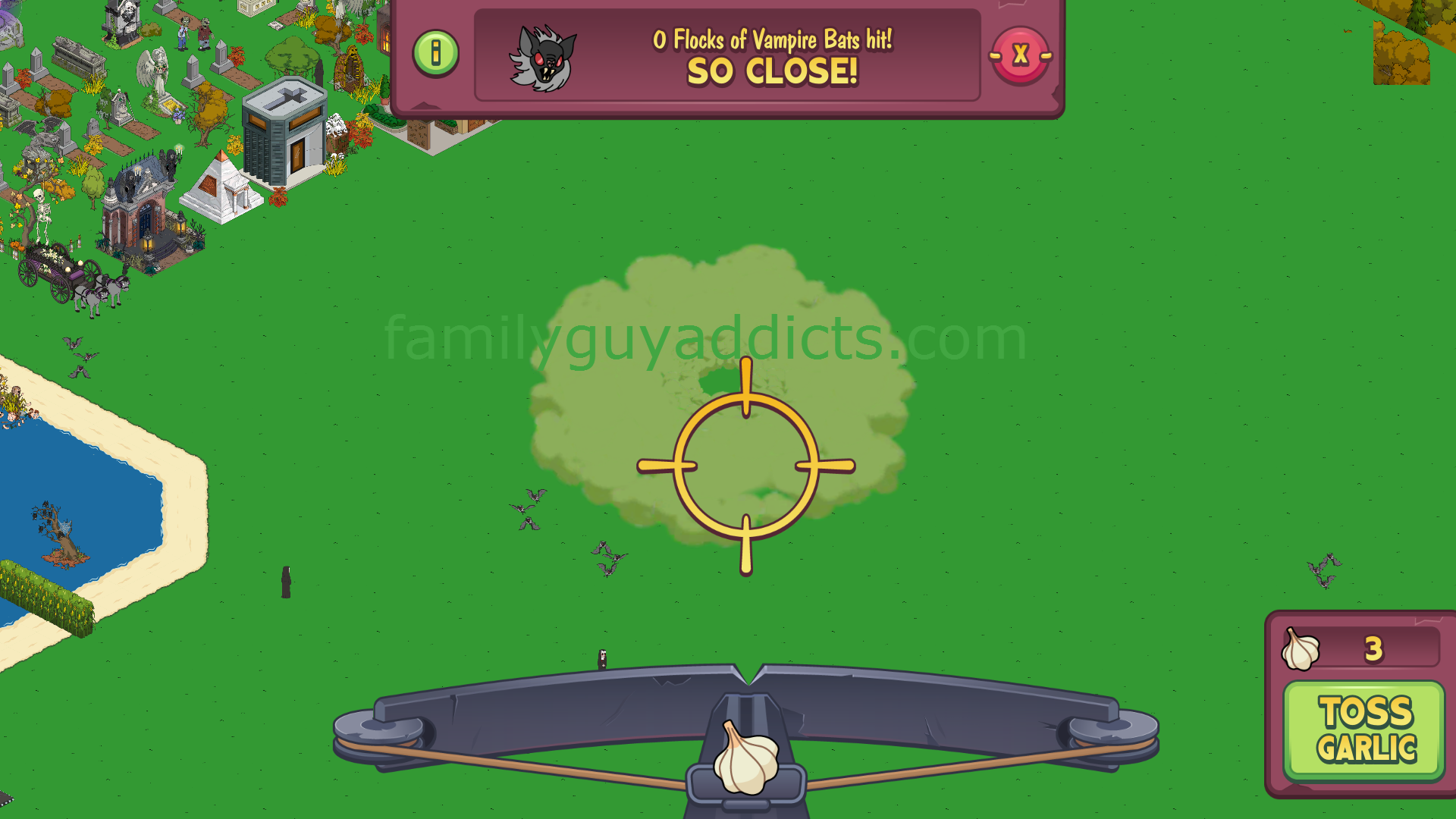 Basically, go to the movie screen to see what creature is spawning next. If vampires are coming out next, I will set a timer on my phone a few minutes sooner than the vampires’ spawn time. Once my timer goes off, I get back into the app and wait for the spawn timer to count down. When the vampires spawn, they spawn in the drive-in parking lot and must walk out toward the town. Because they are restricted to this direct path, if you tap on all vampires directly after the spawn, you can launch a garlic bomb a little bit in front of the bat flocks and they will all be dusted. And getting a mass amount of bat flocks at once almost always results in a big payout. If you can keep a close eye on your spawn timer throughout the day, I strongly recommend using the method.