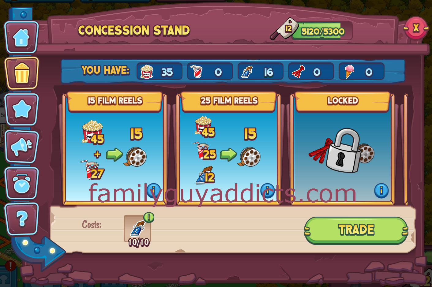Quick question.. I have finished the weeks prizes from the film reels. I now only have the option to trade 15 chocolate bars for 5 film reels. Based on how this week has gone with using combos of concession stand items:
