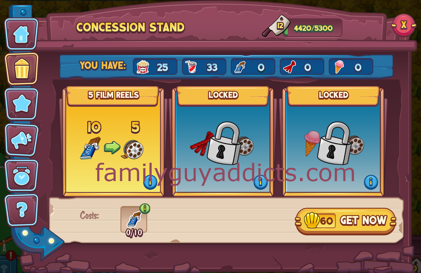 Let the Sodas stack up. Also… don’t forget to scroll left too. Many keep missing that there are options to the left and right of the pop up in Concessions. But stack chocolates. I found MORE options came usually when I had like 40 to 50 stacked.
