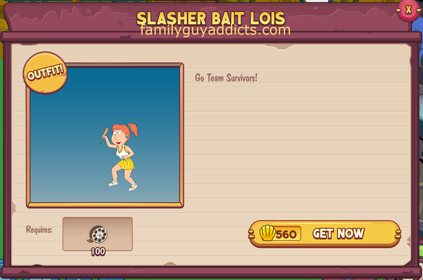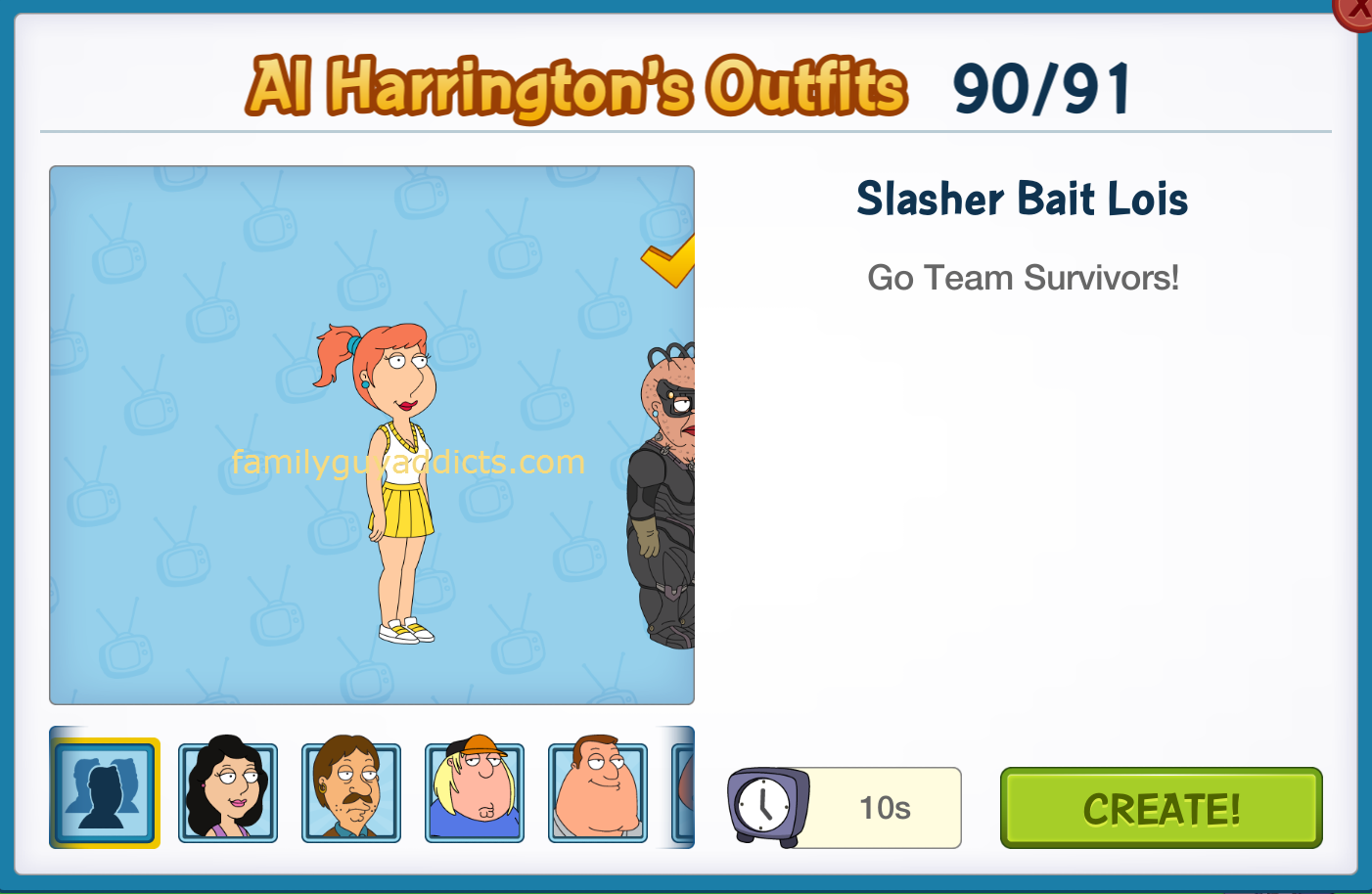 Slasher Bait Lois  is also a part of a Clam Character Group, Slasher Ready. Earning all the Characters in the Group and completing it will earn you an extra 10 Free ClamsClam Icon. Since she completed my Collection, the Clams were added to my totals.