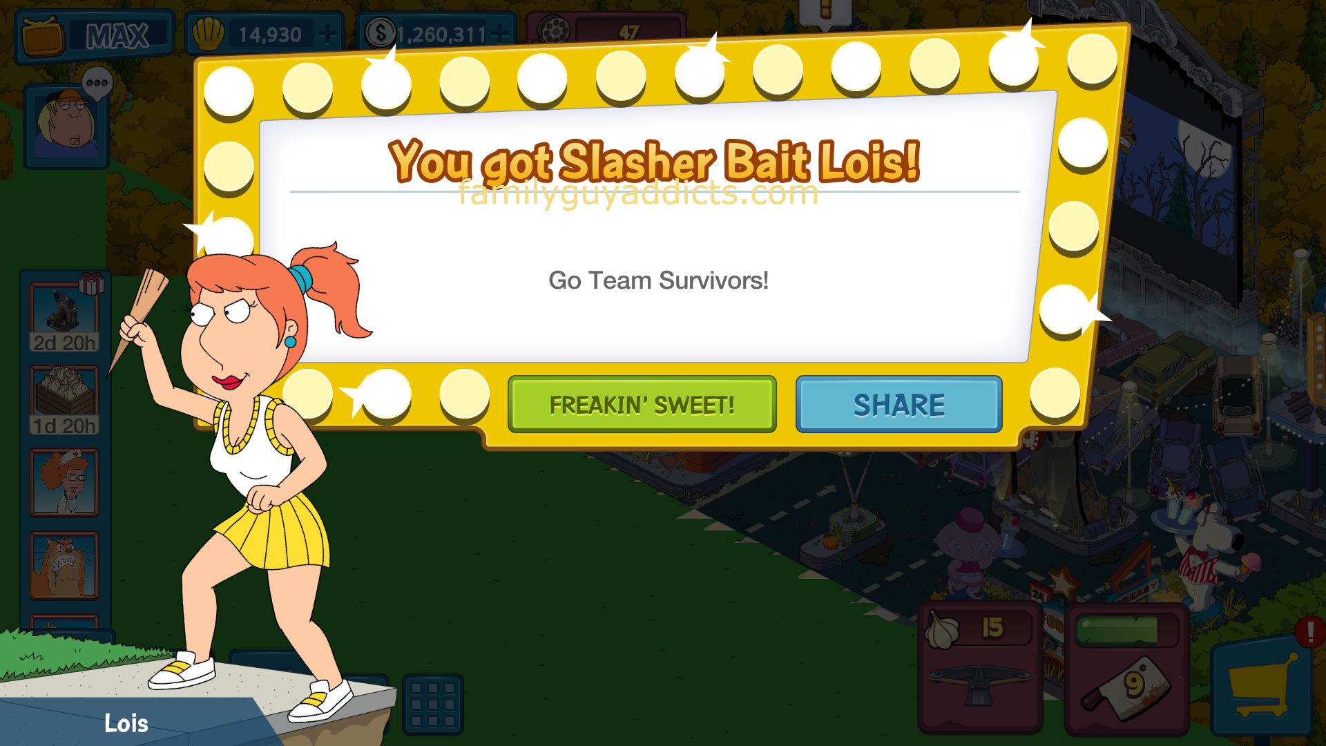 Slasher Bait Lois does come with a complete set of Tasks! Tasks that will help you earn $$$ & XP. She also helps get Pumpkins. Pumpkin
