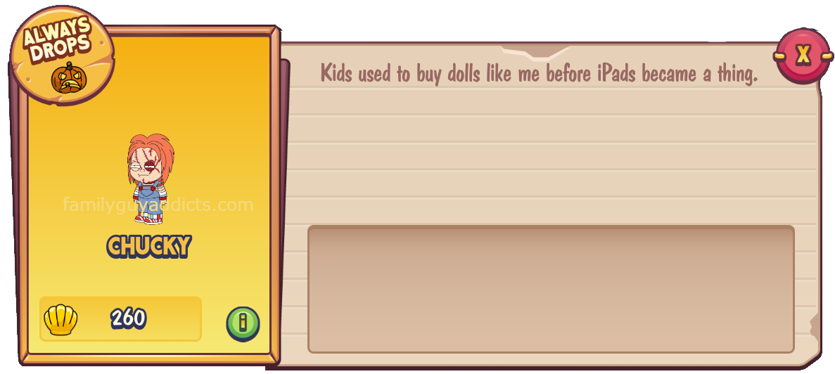 With this New Phase 3 for the Event, we also get some New Premium Characters for you to decide to add to your Quahogs. Like Chucky!
