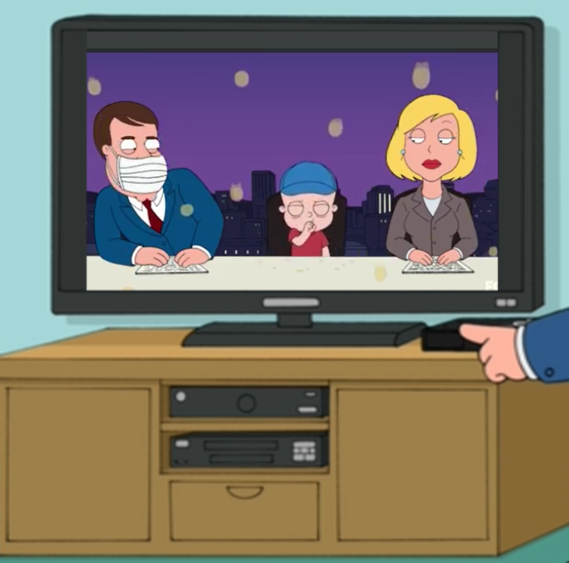 Peter and Brian are sat watching the news, in which Tom Tucker is wearing a face mask – as a result of the Make-A-Wish kid in the studio, “who, as you’ll find out as the show goes on, is quite a cougher”.