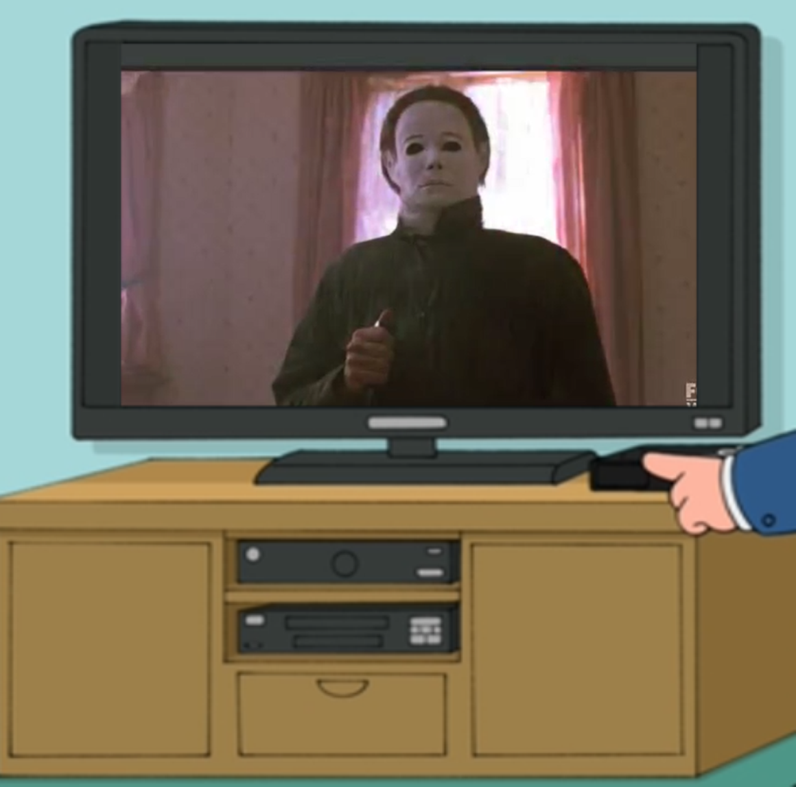 Peter rushes to the DVD player to check, and Tom’s upbeat voice is heard in a scene with Michael Myers looking pretty scary: “Good evening, I’m Michael Myers. I have enormous psychological problems and I’m going to take them out on you!”