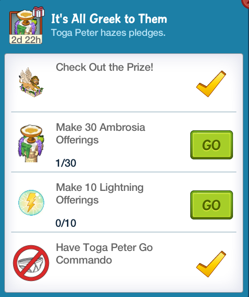 Toga Peter is a New Character Costume added during the first week of Greek Life 2016. As with many costumes in the game in order to get him you have to collect lots of stuff! After Greek Week Pt. ??, players are prompted to create the Toga Peter outfit by the Toga Party questline. Tapping on Go will take you to Al’s where he can be made.