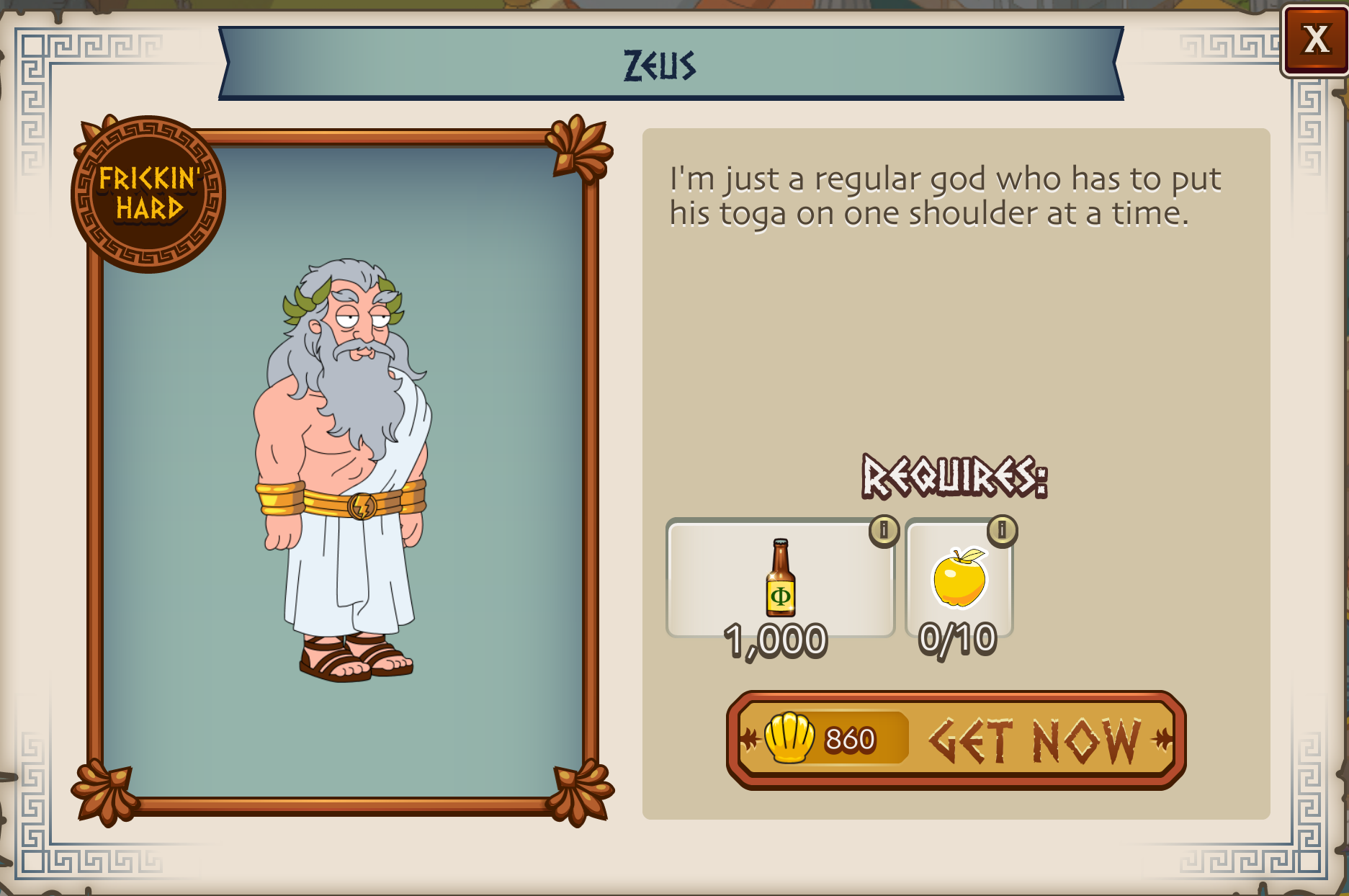 Have Zeus Hang Out with Mortals – 12 hrs, Earns 12