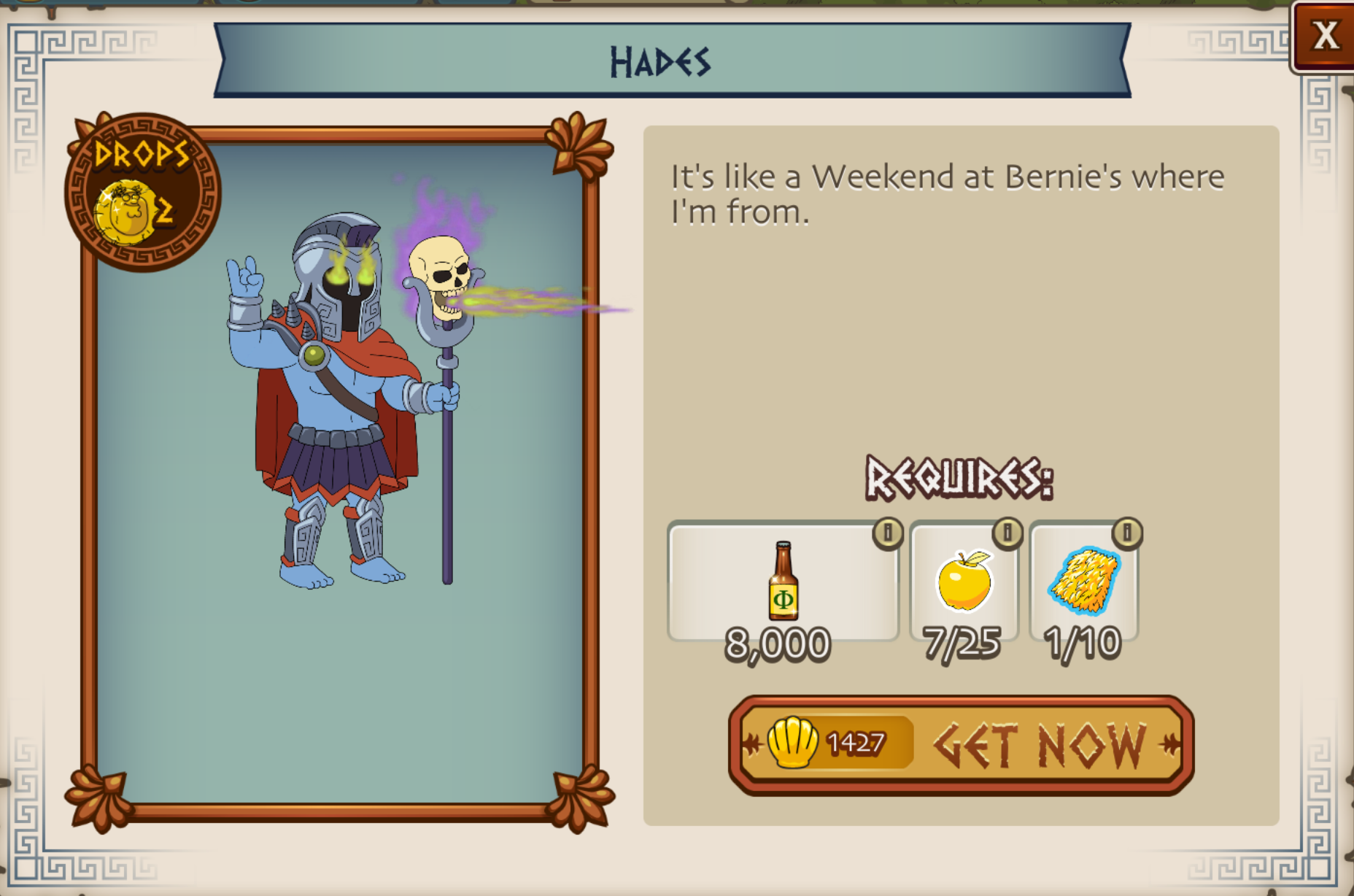 I am not sure I can get hades, but even if I could, I may just hang on to materials for the next phase. Right now, I still don’t have Brian, so I will only have about 2k in ambrosia once I get him. Still enjoying the creativity of the event.