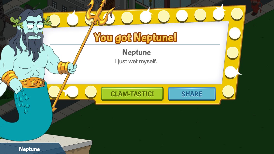 TIMER WARNING!!!For Neptune, the STUFF you had to earn for him revolved around the University Store. The prizes in the Store were available to be unlcoked in any order and once you opened the Store this started Neptune’s 5 day timer. If you tapped on him in there you could see what was required to unlock him: 5,000 Ambrosia, 14 Golden Apples, 8 Golden Crowns (By Clearing Reverse Merman OR using Xena to Slay the Patriarchy) and 11 Golden Fleece.
