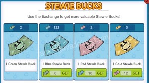 You need to trade up your Stewie Bucks. You can trade 10 Blue Stewie Bucks to get 1 Red Stewie Buck, and then you need to trade 12 Red Stewie Bucks to get 1 Gold Stewie Buck.