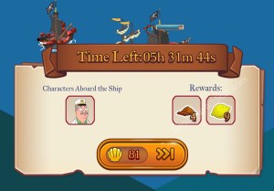 Once you select your character/s you will see the damage they can do, the cost of the attack, in these battles it is 6 bottles of whiskey, (you can collect these from clearing octopuses or from Tinkerbell’s 4hr task Make Small Talk), and the reward you will receive once victory is yours. In the example above the attack takes 6 hrs and the reward is 4 Cinnamon and 9 Lemons. Once an attack is underway you will see your schooner firing on Blackbeards squadron, if you click on it you will see the time remaining and confirmation of the reward you will receive.