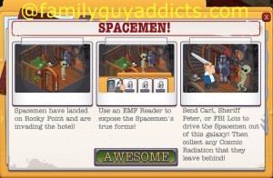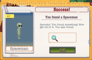 If your investigation was successful clearing the released spaceman is similar to that of the poltergeist in Week 1. To clear spacemen you will require either Sheriff Peter, New Carl or FBI Lois. All have a task Clear Spacemen. It takes 3 hours to clear a spaceman.