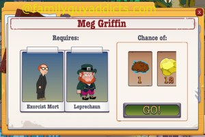 To clear/exorcise Pobsessed Meg you will require either Exorcist Mort or Leprachaun. Simply tap Possessed Meg and the screen below will come up, tap GO and whichever character you have available will instantly exorcise Meg.