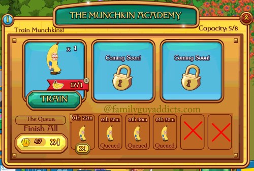 You will see the academy capacity in the top right corner of the training screen, you will see the capacity of the Munchkin Academy at this time is 8, this means you can only have a total of 8 created and/or Banana Munchkins in training at any time. If your capacity is showing full, you can free up capacity by using some of your Banana Munchkins to shoo away some Flying Monkeys. This capacity may increase in Weeks 2 & 3, we shall find out once Week 2 content hits later in the week.