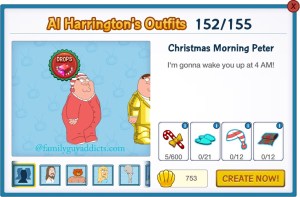 CHristmas Morning Peter is a New Character Costume added during the first phase of Quahog’s Not So Silent Christmas. As with many costumes in the game in order to get him you have to collect lots of stuff! You will see him right from the start in the shopping cart, but you will also be directed to unlock him via the Fit’s Person Looter questline. Tapping on Go will take you to Al’s where he can be made.