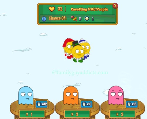 Knowing it is not that easy to get an Inky Ghost as they are not that common, the most common combination you will use is 1 Pinky Ghost, which does 15 damage each, and 2 Clyde Ghosts, which do 10 damage each. 15 + 10 + 10 = 35, more the 32 damage you need to defeat a PAC Caroler.