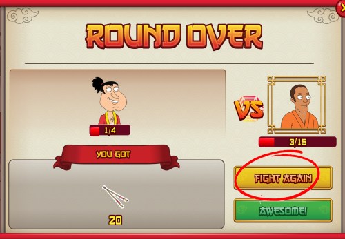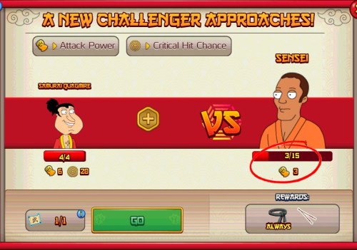 I am getting SOOOO annoyed…my characters had never missed any attacks for the couple of weeks but now Quagmire is missing 80% of the time when I fight Samurai or Sensei! How can I get Billy Blanks if I can’t get the blackbelts because I’m wasting all my fight coupons TRYING to hit them? The only thing I need for Billy is the pond, but at this rate it will take days just to beat a couple of Sensei. Not to mention if these misses continue when I FINALLY get to fight the chicken with 3 people at once! What is going on with these MISSES!?!