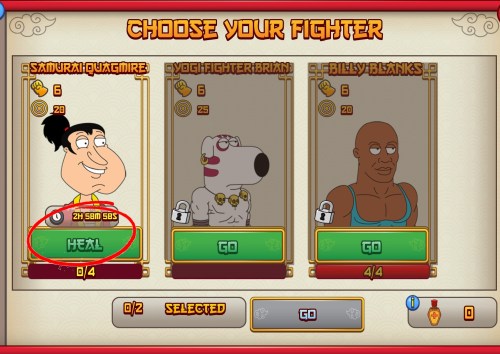 If you are knocked out, lose all your health points, you will automatically start to heal, you will see the time to heal your Samurai Quagmire freemium is 3hrs, (3hrs is the standard time to restore all 4 health fighters to full health).