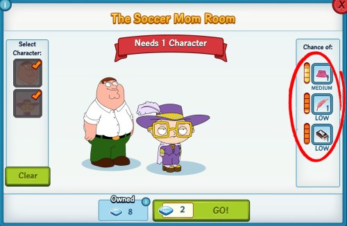 I notice that once you receive all required items from a room then your probability of gaining other items from that room increase. For example, once I gained all 6 Pink Handbags from the Soccer Mom Room then Feathers went from Low to Medium and Matchboxes stayed Low but the bar of colour increased. Presumably once I have all the Feathers I need, the probability of getting Matchboxes will increase once again.