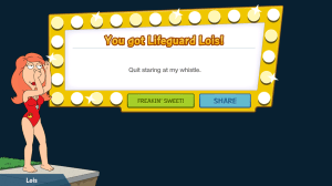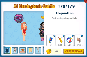 Lifeguard Lois is a New Character Costume added during Week 2 of Quahog Heat 2016. As with many costumes in the game in order to get her you have to collect lots of stuff! You will be directed to unlock her via the I Wanna Be a Lifeguard questline, at Let’s Play Some Cards Pt. 1. Tapping on Go will take you to Al’s where she can be made.