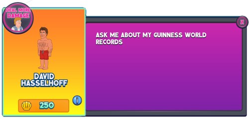 Personally, I usually only buy a character if it’s something I really want in my game, I rarely buy just because it will help in an event. And I have to say I already bought Chopper Cop Quagmire in Phase 1, so I’m not going to buy any other premiums just to help out in the event, it’s going to have to be someone I really, really want, and I’m afraid Davud Hasselhoff doesn’t excite me, so my clams are staying in the bank.I  would possibly have taken the plunge if I was really behind and was a fan of the actor as he will help you move along in this Phase: with the cheaper investigations, and inflicting damage on Michael Pulaski.. So if you’re a fan and you’re short on time, or like a hand up in events this is a tempting buy as it’s a full character not a costume. I think a lot will depend on how you’re finding your Police Tape drops and progress going. Mines have levelled off a little with this Phase, but Brian now has a Police Tape drop, so hopefully that will help. But I have to say during this part of the event it’s hard to say with the random nature of things exactly how valuable he will be. I was disappointed Chopper Cop Quagmire didn’t help me do more in Phase 1, but then it turned out he was useful in Phase 2 for battling Kingpin Consuela and now in this phase for battling Michael Pulaski.  David Hasselhoff may be the same, ie he will be an ongoing help but not be a massive help. But for me it’s a no as I have Chopper Cop Quagmire for attacking Michael Pulaski. And I also don’t think it looks like David Hasselhoff at all, is it just me?
