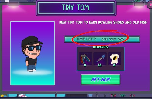 If you can’t get the Heart Meter to Zero within the 24hrs, Tiny Tom will escape back to the bank and you will NOT get any Payout for losing other than the task payout on the Character/s which is 1 Bowling Shoe for each 2hr attack completed. You need to do a new investigation to bust him to battle him again. And as I said earlier what heart meter level he comes back at is random.
