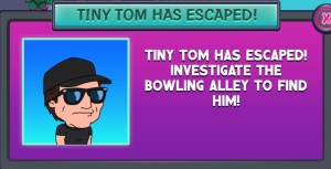 - You can leave a character battling Tiny Tom even though he has no cool down as he disappears as soon as you beat hm. This way you can leave the Character battling and NOT select their check mark while you try to find another Tiny Tom at the Bowling Alley. Then you don’t have to wait a full 2hrs to attack him, just whatever time is left on the Character you left battling. However with rooms to investigate you may not think this worthwhile at this stage in the event. I personally haven’t used this tactic in this event.