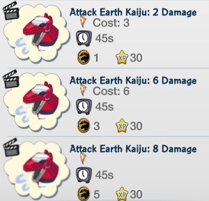 For example for the 1 Heart Meter Earth Kaiju, you only want to select the Attack Earth Kaiju – 2 Damage task. This will result in you fully defeating the Earth Kaiju for the minimum amount of energy, which for this task is 3.