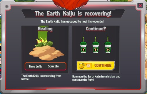 This tells you the time until the Earth Kaiju will return, and the clam cost to bring him back immediately, please note this clam cost will vary depending on what heart level he was defeated to when the Recovery initiates. Once he returns from his 5hr Recovery he will be back at Heart Level 1, and you can start trying to defeat him to the top-level again.