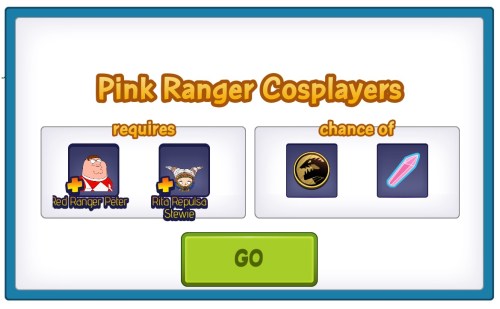 This is pretty simple, you need Red Ranger Peter or Rita Repulsa Stewie (premium character costume for Stewie) to clear Pink Ranger Cosplayers, both have a 6 hour task, yes you read that right 6 hours, to do this.