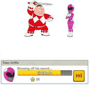 It takes 6 hours to clear each Pink Ranger Cosplayer and you can see the task progress by clicking on Red Ranger Peter or Rita Repulsa Stewie during their task.