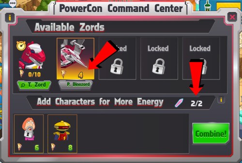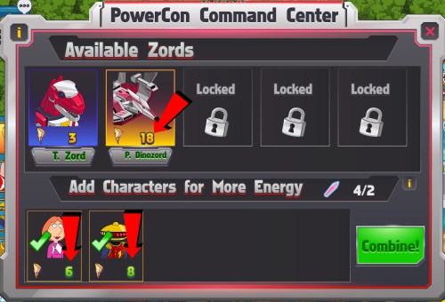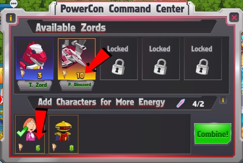 In order to do this, you simply need to select your P-DinoZord, then choose the character to add to the combination from the PowerCon Command Centre. For example if you select Pink Ranger Lois, you will see a check mark in her box and the P-DinoZord strength will now show as 10.