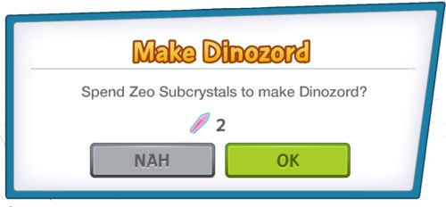 If you have 2 Pink Zeo SubCrystals available simply Tap Combine and you will see the following box pop up. ***Please note you don’t neec to have unlocked Pink Ranger Lois or the have Alpha 5 to use your Pterodactyl DinoZord. They are simply used to create a stronger version – more on this later***
