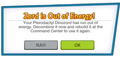 Then tap Combine and agree to spending the 2 Pink Zeo SubCrystals to release the stronger Pterodactyl DinoZord into your game. You can then do tasks until his energy is fully depleted. We’ll talk more about what happens once your Pterodactyl energy is depleted a little bit later.