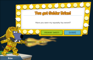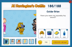 Goldar Brian is a New Character Costume added during Week 2 of the Mighty Morphin’ Griffin Rangers 2017. As with many costumes in the game in order to get him you have to collect lots of stuff! You will be directed to unlock him via the Go for the Goldar questline, after Power Conned Pt. 3. Tapping on Go will take you to Al’s where he can be made.
