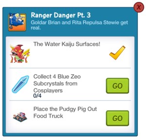 I unlocked blue ranger yesterday. I’ve attacked water kaiju 5 times; at the 2&5 levels then at 2,5&12 levels. So far ZERO stuffed triceratops drops – so I’m 0 for 5. But I only need 1 more triceratops morpher (didn’t buy any of the buildings – the drops from Herbert were great and pretty good from clearing blue ranger). So I have 6 days for the 1 morpher and 5 stuffed triceratops – hoping drops will improve – but I’ve got to wait 19 hours (13 left on the clock and then wait 6 more) to attack again and see how it goes…
