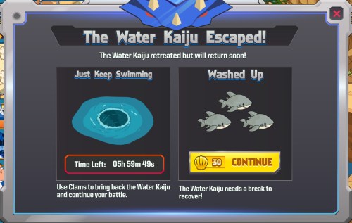 This tells you the time until the Water Kaiju will return, and the clam cost to bring him back immediately, please note this clam cost will vary depending on what heart level he was defeated to when he escaped. Once he returns he will be back at Heart Level 2, and you can start trying to defeat him to the top-level again.