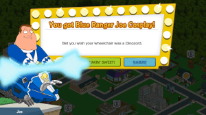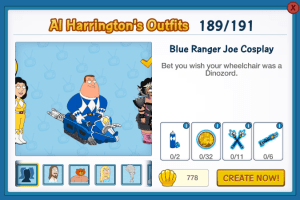 Blue Ranger Joe is a New Character Costume added during Week 3 of Mighty Morphin’ Griffin Rangers 2017. As with many costumes in the game in order to get him you have to collect lots of stuff! You will be directed to unlock him via The Boys in Blue questline, at Ranger Danger Pt. 1. Tapping on Go will take you to Al’s where he can be made.