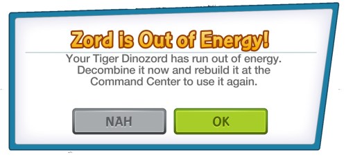 Then tap Combine and agree to spending the 3 White Zeo SubCrystals to release the stronger White Tiger Zord into your game. You can then do tasks until his energy is fully depleted. We’ll talk more about what happens once your White Tiger Zord’s energy is depleted a little bit later.