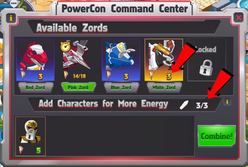 In order to do this, you simply need to select your W Zord, then choose the a White Ranger character to add to the combination from the PowerCon Command Centre. You will see a check mark in his box and the W Zord strength will now show as 8.