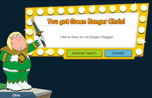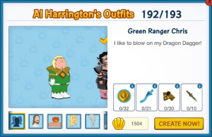 Green Ranger Chris is a New Character Costume added during Week 4 of Mighty Morphin’ Griffin Rangers 2017. As with many costumes in the game in order to get him you have to collect lots of stuff! You will be directed to unlock him via the Green Ranger With Envy questline, at Mighty Morphin Griffin Rangers Pt. 1. Tapping on Go will take you to Al’s where he can be made.