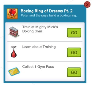 I have long given up on this one due to the rarity of drops for the gym passes AND the rarity of drops for the meats. I waited till I had Boxing Peter and almost all the buildings needed to drop for Rocky, but since the meats don’t drop, there’s no way I’ll be able to get the 15 robes for Rocky. Boo TinyCo… Boo…