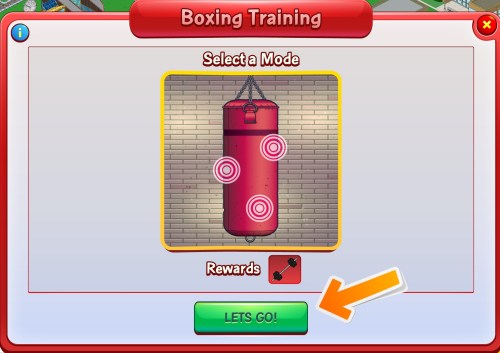 You will then see the Boxing training mini-game screen, it will show you the time you will have to train and the cost to train, 3 Gym Passes.
