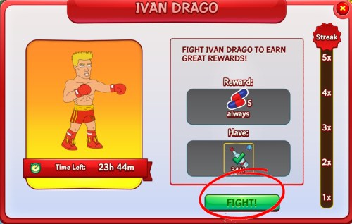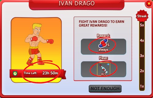 Tap Ivan Drago   and you will get the attack screen. It will tell you 1: How many Vodka you need to Fight him at that level, 2: The rewards for fighting him at that level, and 3: How much time you have left before he disappears.