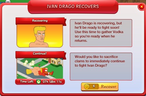 Remember you only have 24hrs to hit him to the highest level before Ivan Drago will go “Recover” (cool down). When Ivan Drago returns, he will be back at 1x.  The “Recover” time appears to be 8/9 hours, and the clam cost to speed up his recovery will vary depending on what Level he was at when he timed out.