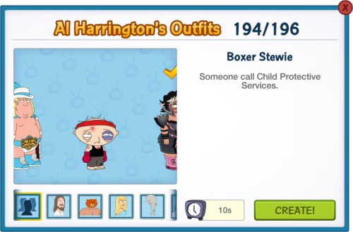 If you win the Boxer Stewie character costume, it will just take you just 1s to finish up and “CREATE!” the Costume in Al’s.