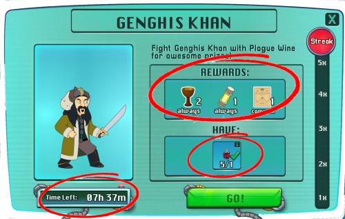The amounts of Plague Wine needed will be the same in every players game. Many players report success in these battles by stocking up on a bunch of the resource before attacking, I’ve personally done this successfully in the past but really how you attack depends on you. Certainly his longer respawn time is helpful for this strategy. I’m going to stockpile to try hit him to 4X then stockpile again as the 5X takes 12 Plague Wine for that 1 attack, whereas 1X to 4X takes 15 Plague Wine total, and let you get extra Time Capsules from the attack Genghis achievement tasks. So that’s my strategy for this Boss, I’m abandoning any thoughts of hitting him at 5X until I’ve got all the Time Capsules I need.