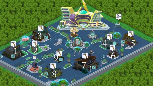 You will also notice MANY hammers to “repair” building as you progress. These are as numbered above: 1 Future Clam; 2 Bill & Ted Statue; 3 Weapons Museum; 4 Fountain of Youth Cryogenic Lab; 5 3D Printing Studio; 6 Flying Car; 7 Wyld Stallyns Concert Hall; 8 JetPack Park; 9 Jetpack Peter Statue.