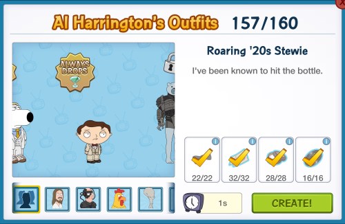Once you have finished collecting all the Materials his Costume requires, it will just take you just 1s to finish up and “CREATE!” the Costume in Al’s. When the timer is up, just tap on the Check Mark above Al’s to pull Roaring 20’s Stewie into your game.