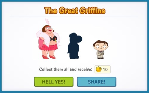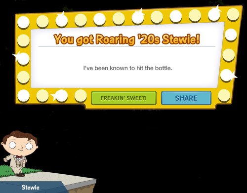 I have managed to obtain the 20’s Stewie costume with half a day to go and without spending any clams, but boy was it a grind! Playing religiously ever 4 hours, setting times to remind myself, and constantly having the 3 characters collecting coffee pots and 3 more collecting axes ( which help collect whiskey which helps in turn to obtain additional martini drinks).