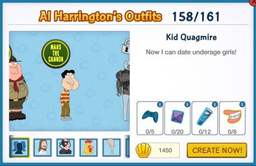 Kid Quagmire is a New Character Costume added during the Wet Hot Quahog Summer event. As with many costumes in the game in order to get him you have to collect lots of stuff! You will be directed to unlock him via the Being Childish questline which triggers after Pt. 3 of the main Questline Welcome To Camp Griffin. Tapping on Go will take you to Al’s where he can be made.